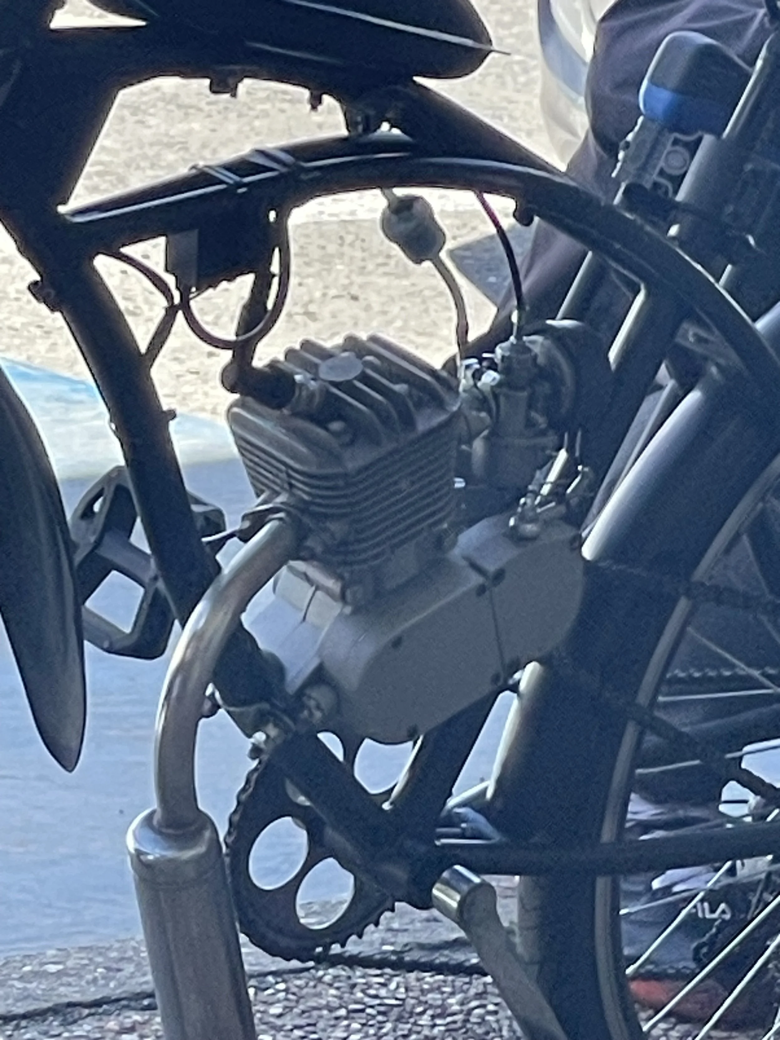 Pedal chain on one side, weed whacker engine on the other.