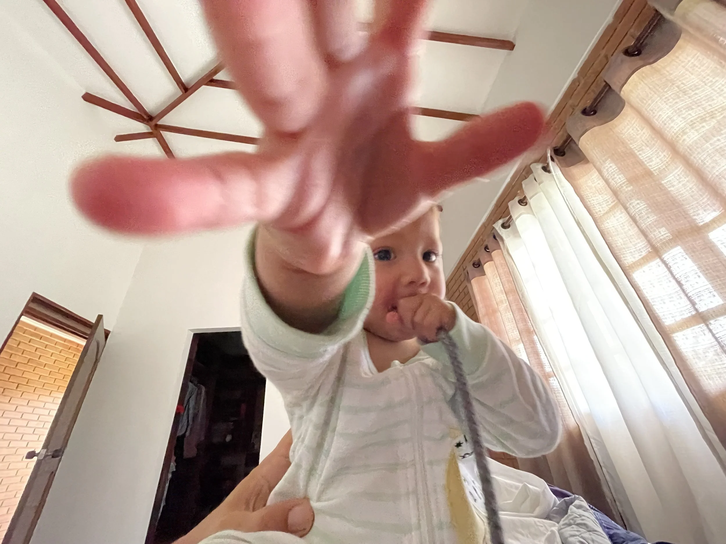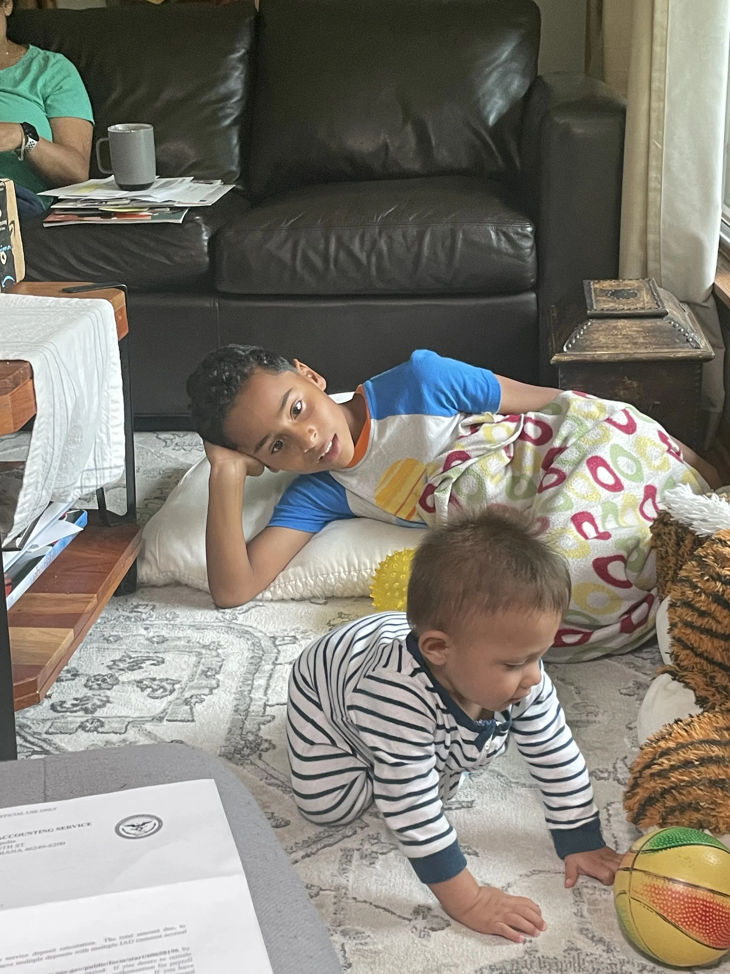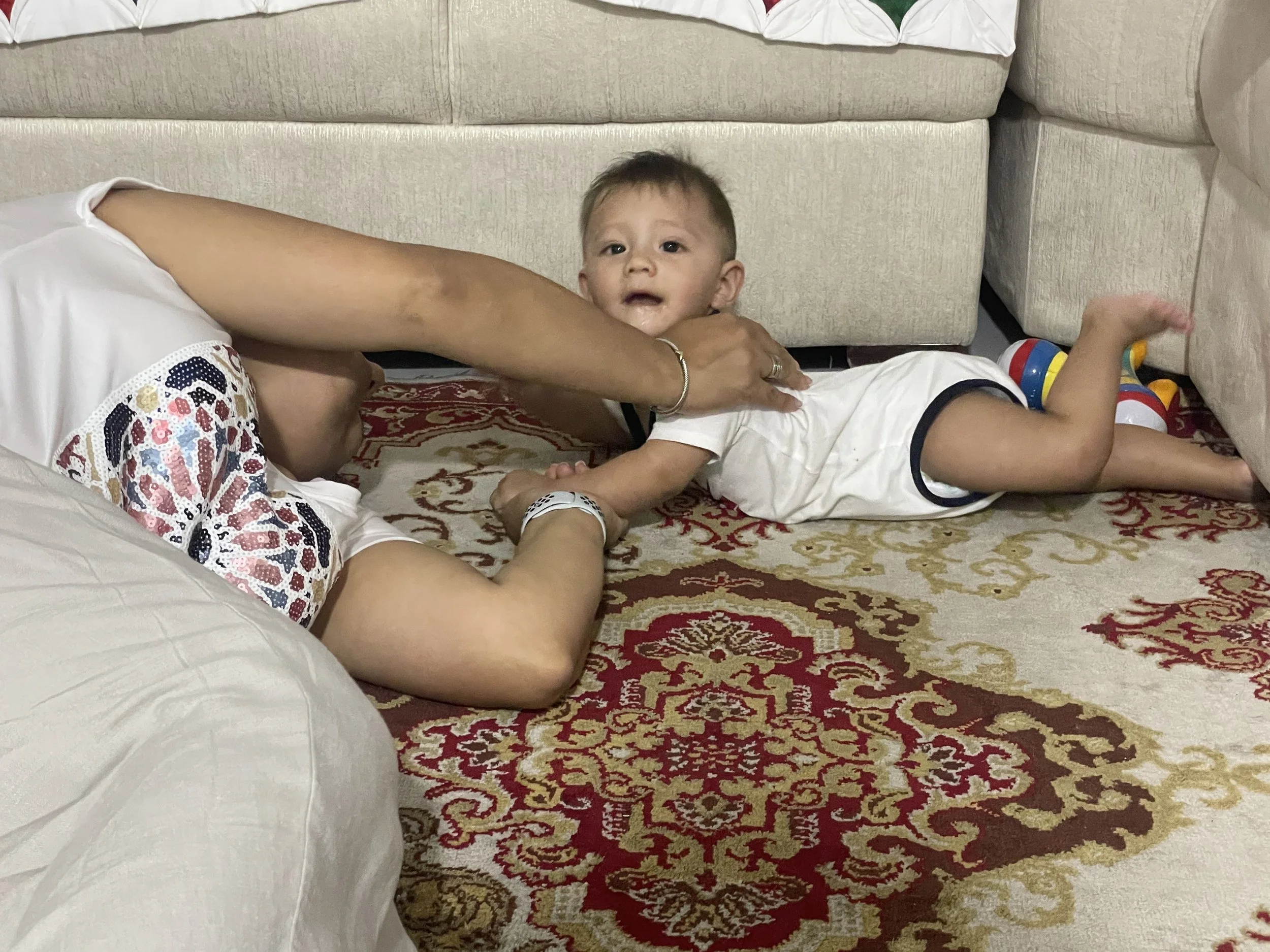 Claudia needed to run an errand with her dad. That left me to take the kids and mother in-law back to their house. As we got into the car, I asked my mother in-law “Tienes miedo? ( are you scared of my driving?). She laughed and said “no”. I asked “porque no!?” To which she laughed again. We got home and peanut was still in need of a nap. He slept but in short spurts. He was rubbing his eyes and clearly wanted to sleep. I brought him back to the room we used to stay in. There was no bed for him so I stacked pillows making a barrier but though he was tired, he did not back down from the challenge. I had to lay down with him to try get him to relax. Vishnu would have none of it. He found my glasses fascinating and discovered that my scapular was a tasty treat. Next thing you know, he heard mamis voice in the living room and all thoughts of napping were gone.