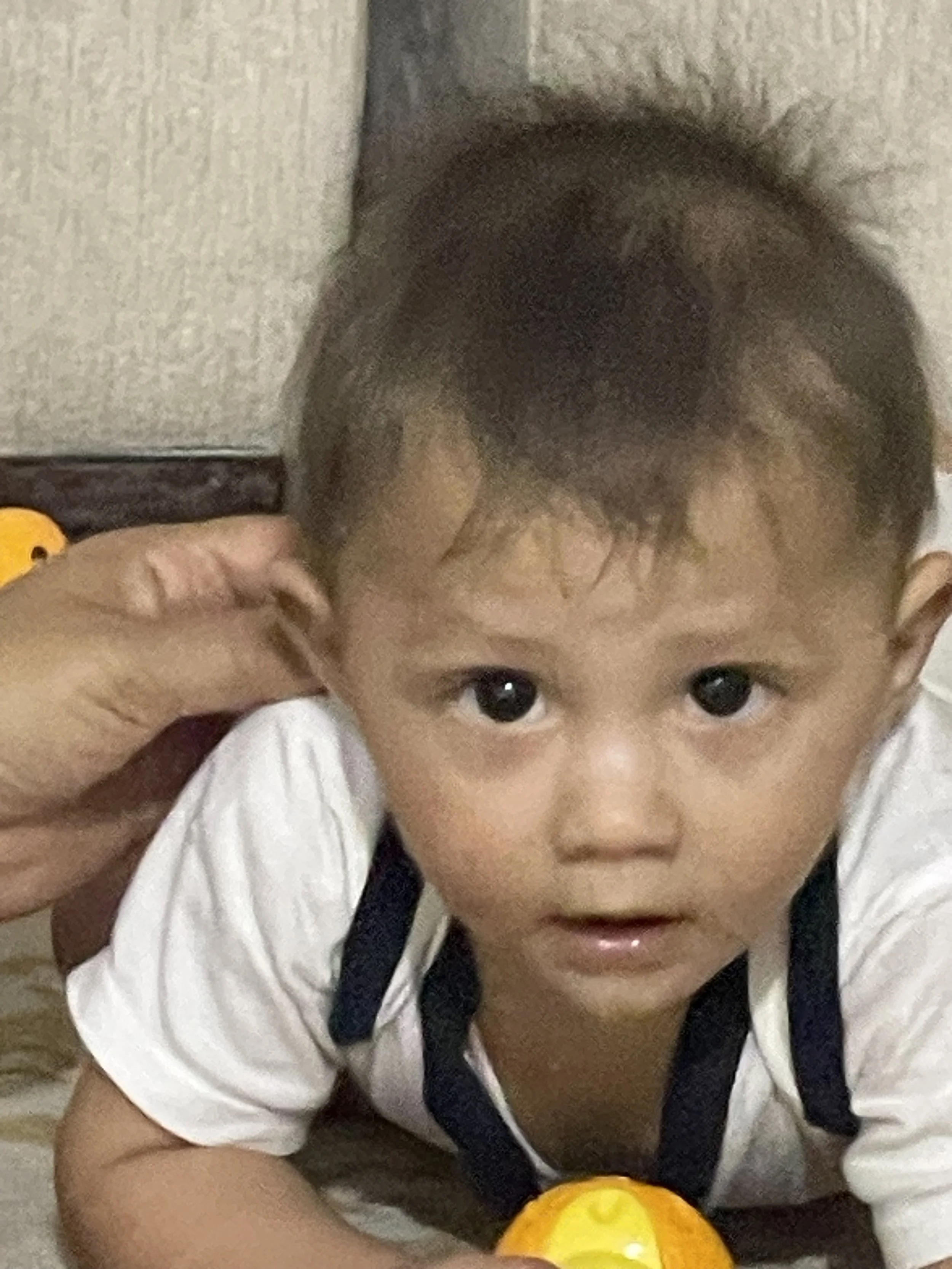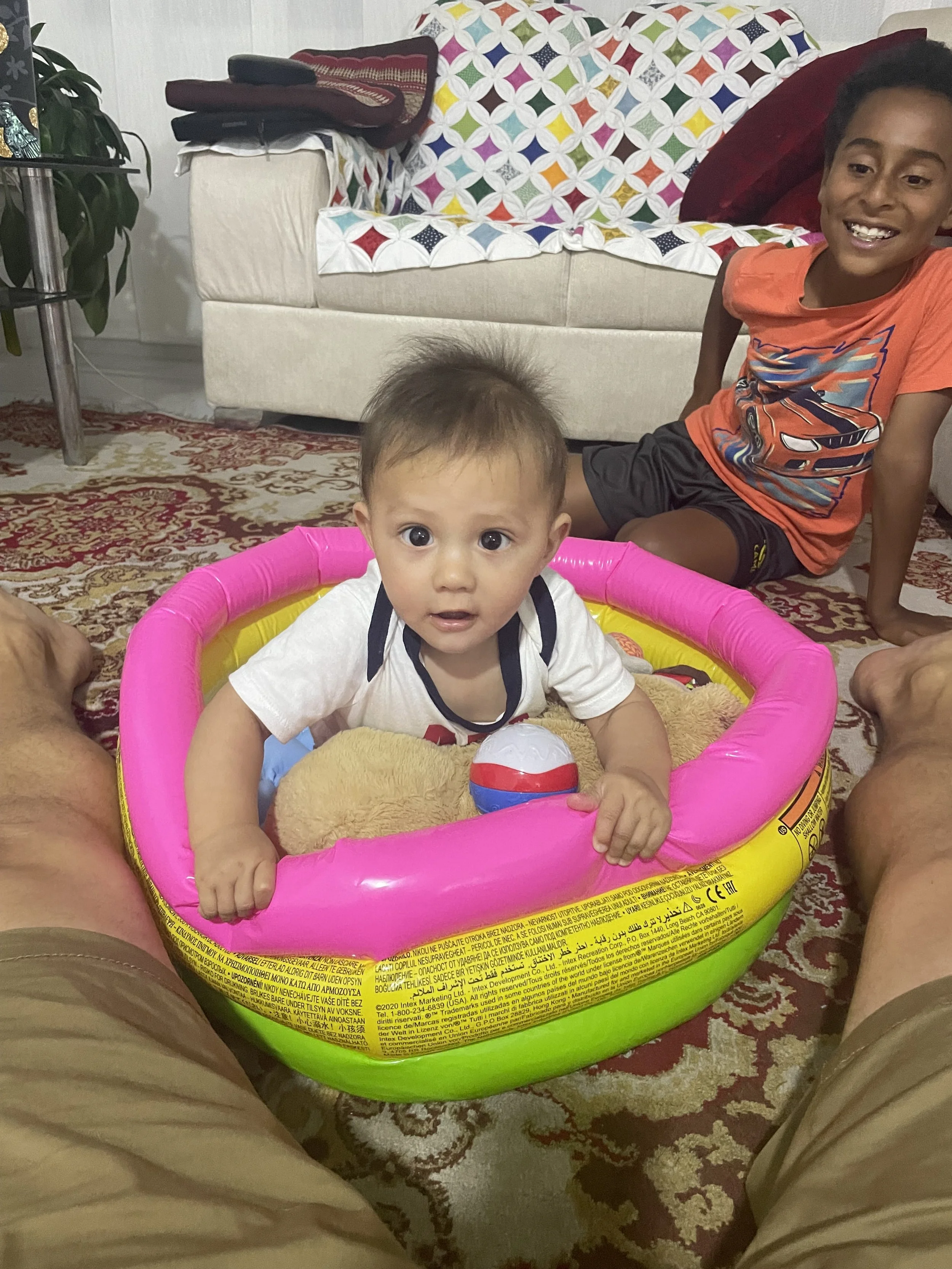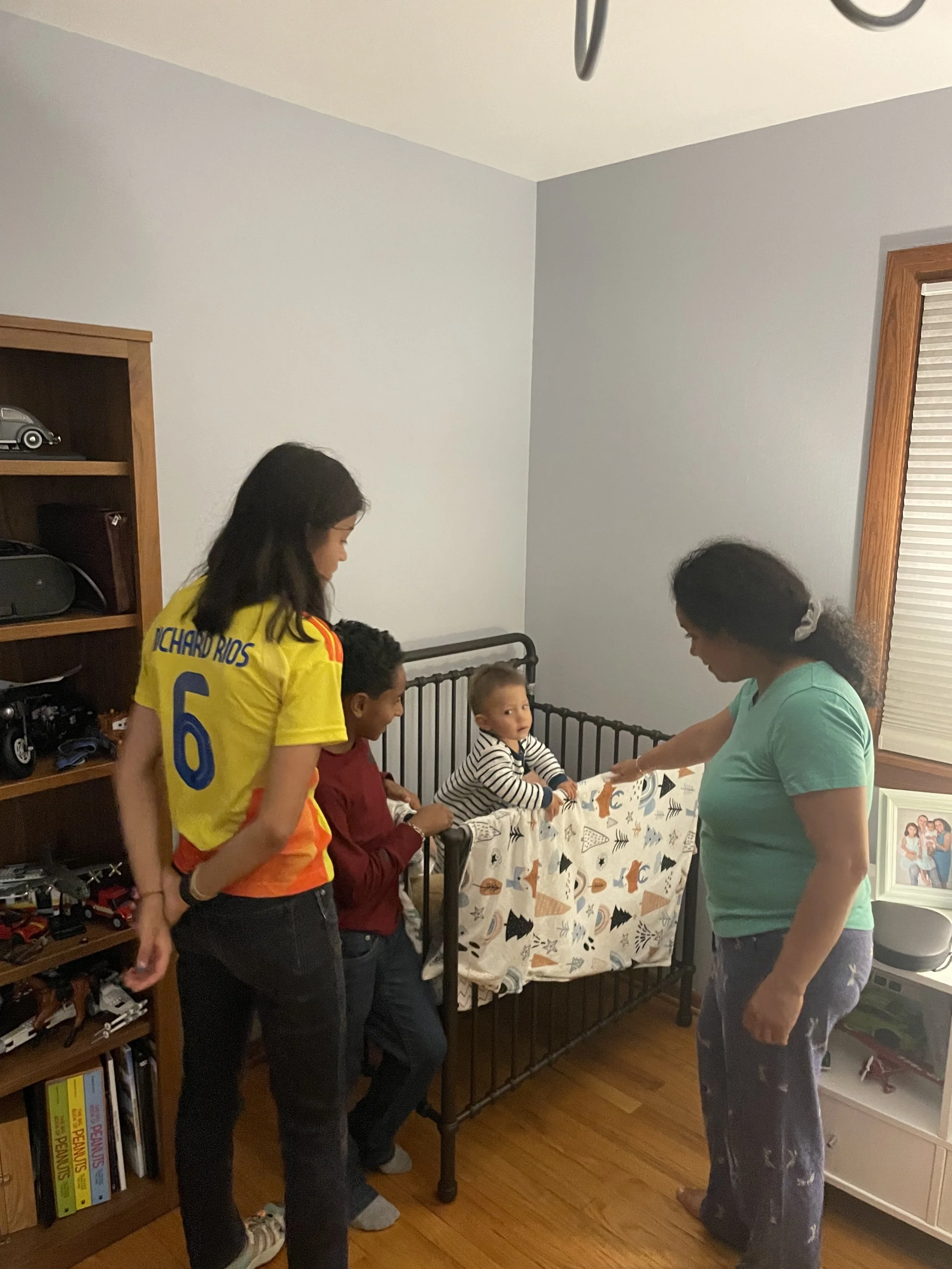 Claudia needed to run an errand with her dad. That left me to take the kids and mother in-law back to their house. As we got into the car, I asked my mother in-law “Tienes miedo? ( are you scared of my driving?). She laughed and said “no”. I asked “porque no!?” To which she laughed again. We got home and peanut was still in need of a nap. He slept but in short spurts. He was rubbing his eyes and clearly wanted to sleep. I brought him back to the room we used to stay in. There was no bed for him so I stacked pillows making a barrier but though he was tired, he did not back down from the challenge. I had to lay down with him to try get him to relax. Vishnu would have none of it. He found my glasses fascinating and discovered that my scapular was a tasty treat. Next thing you know, he heard mamis voice in the living room and all thoughts of napping were gone.