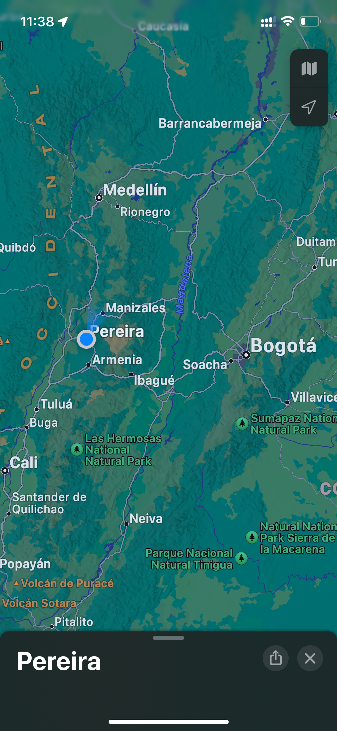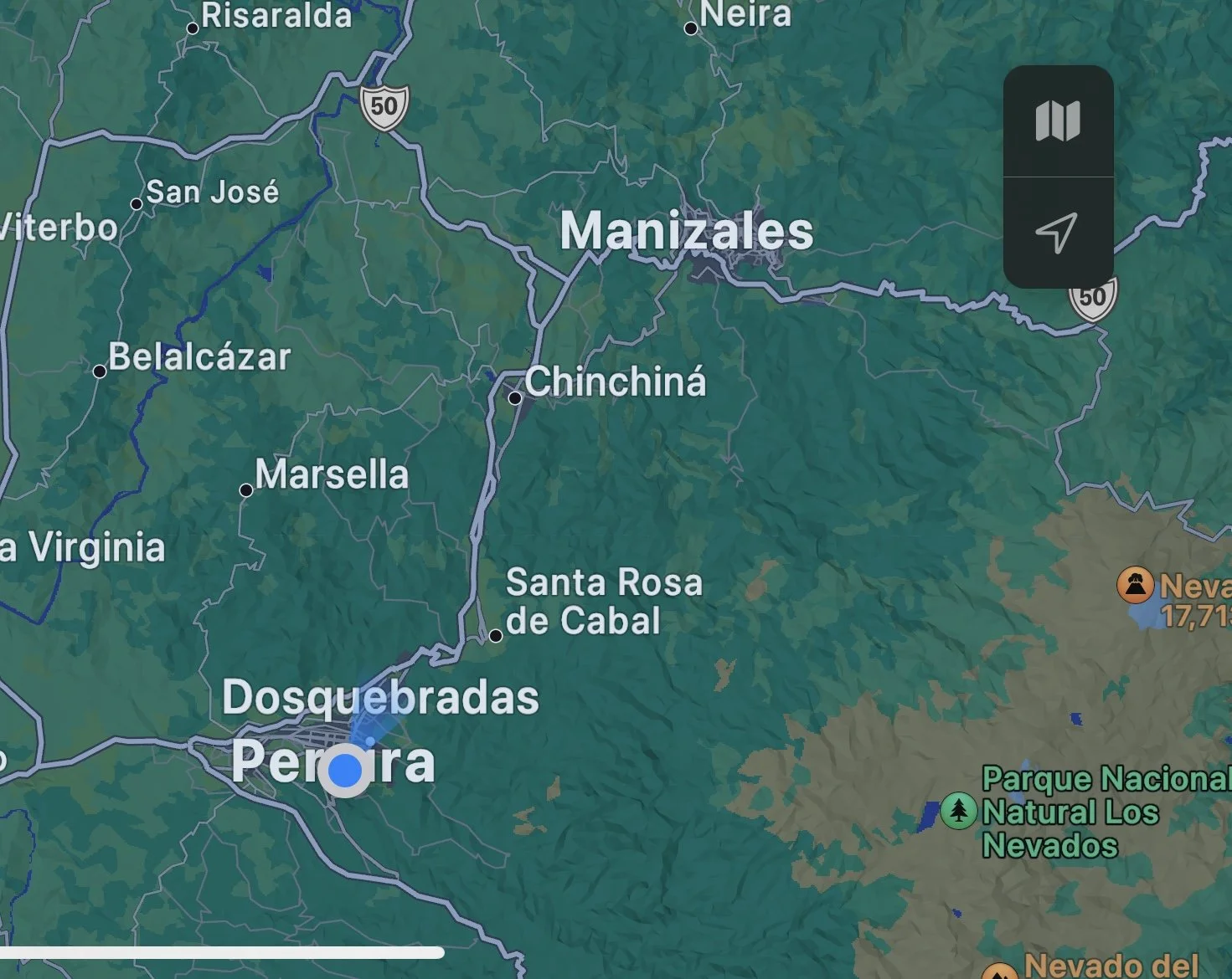 Pereira is about 200 miles west of Bogota and pretty much the half way point between Medellin and Cali.