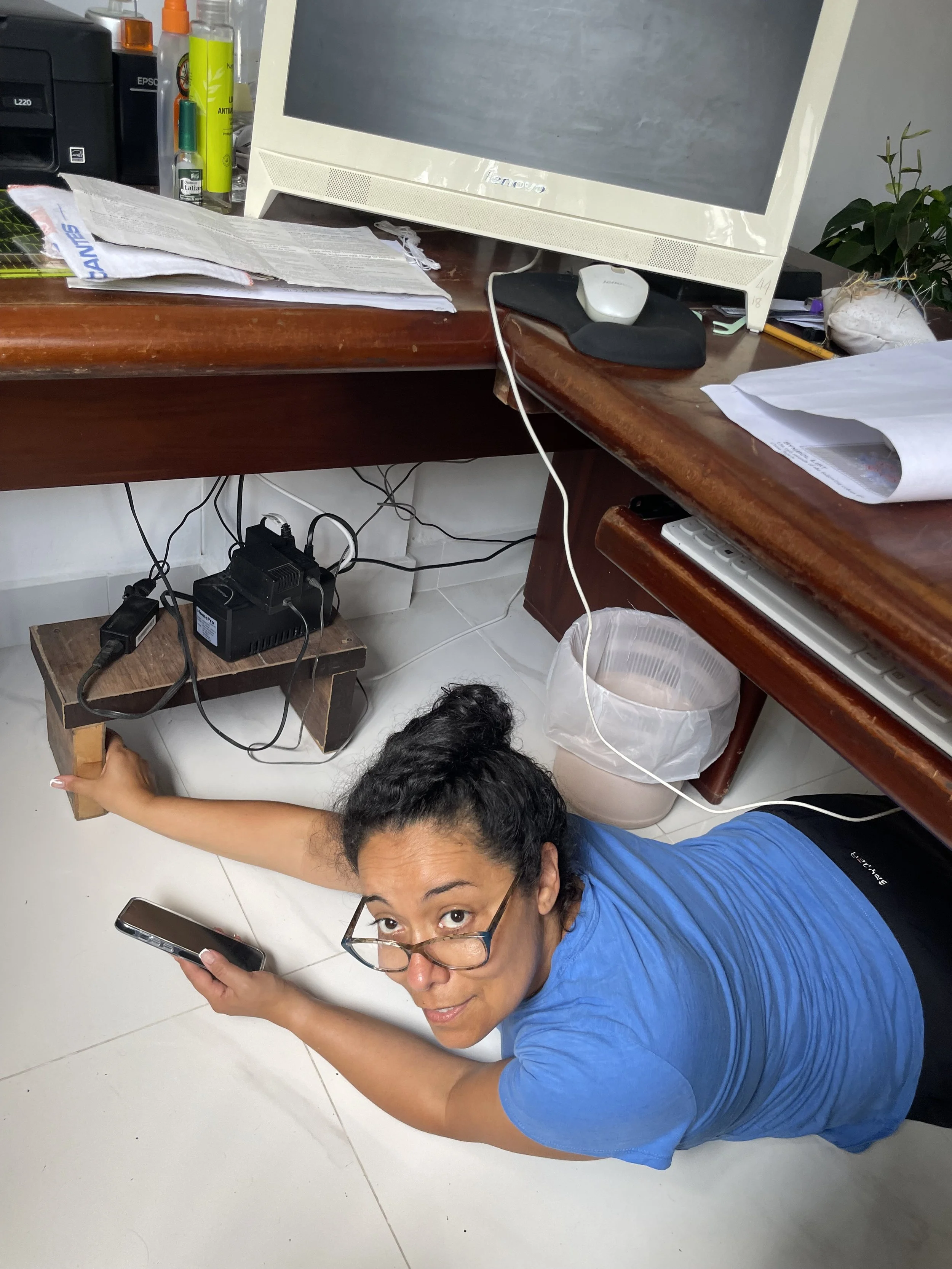 Connectivity remains an issue here. Mental notes to make for the future. I say this with all due respect and keep in mind that my in-laws are upper 70’s and low 80’s. Some of the equipment they are using is pretty dated. In this picture (which I will be yelled at for), my darling wife is doing her impersonation of a cable installer.