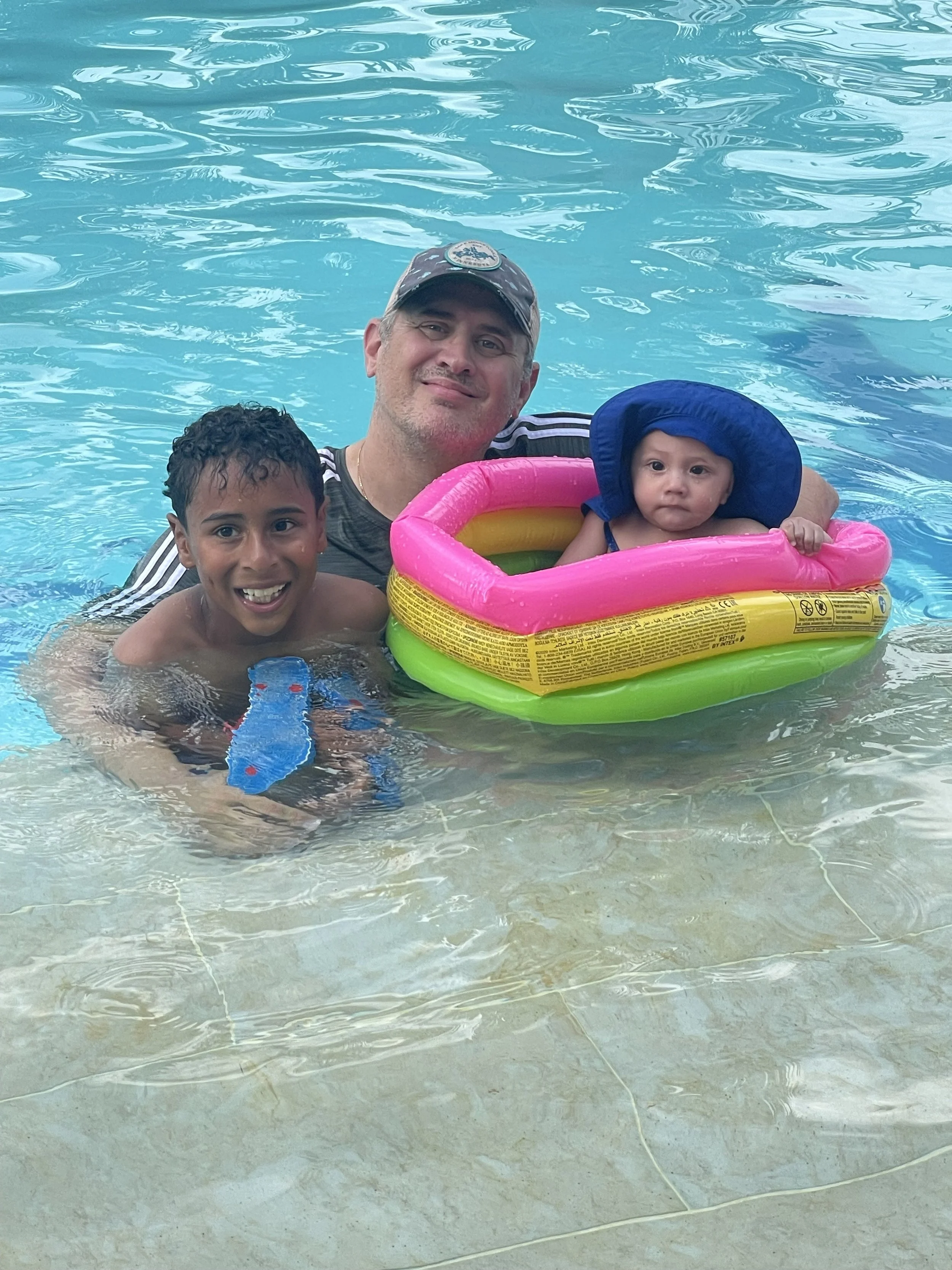 Anyway, by the time peanut woke up, everyone was coming back to the house. Never mind, I got his suit on, bottle warmed, and we head up. Unfortunately, peanut & I were only in the pool for 5-minutes and we were called to lunch. Bummer! After lunch, nap time for the lil dude but he LOVES that water! The afternoon we’d try it again.