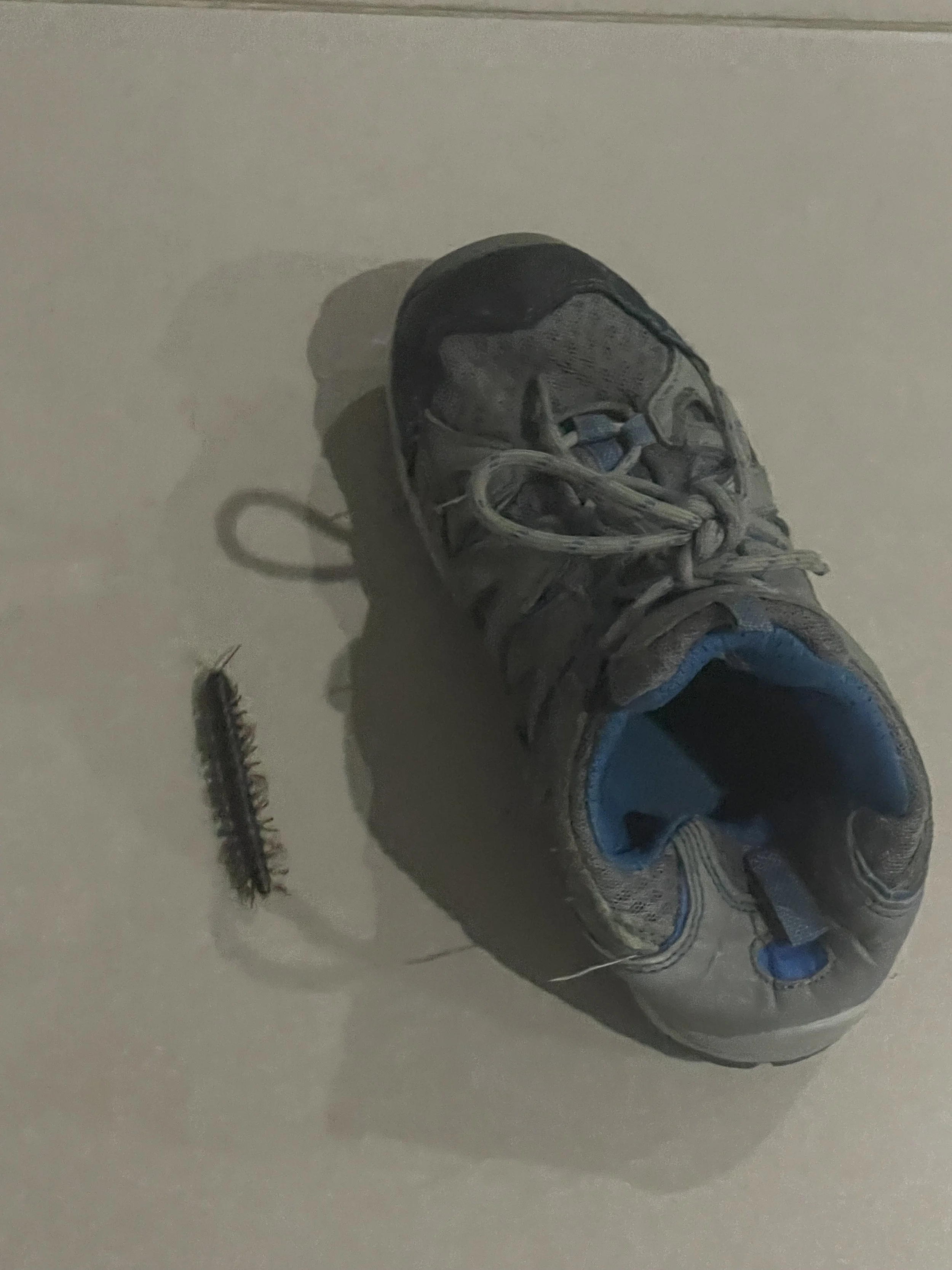 Fat & Furry but not too fast. I put Santi’s shoe for some scale. It was big but I’ve seen bigger. He was an easy catch. We rolled up towels and put the at the bottom crack of the door. After the kids went to bed, this guys little brother came scootering through. Not nearly as big but he put up a big fight. I think that one had a thousand legs that moved insanely fast.