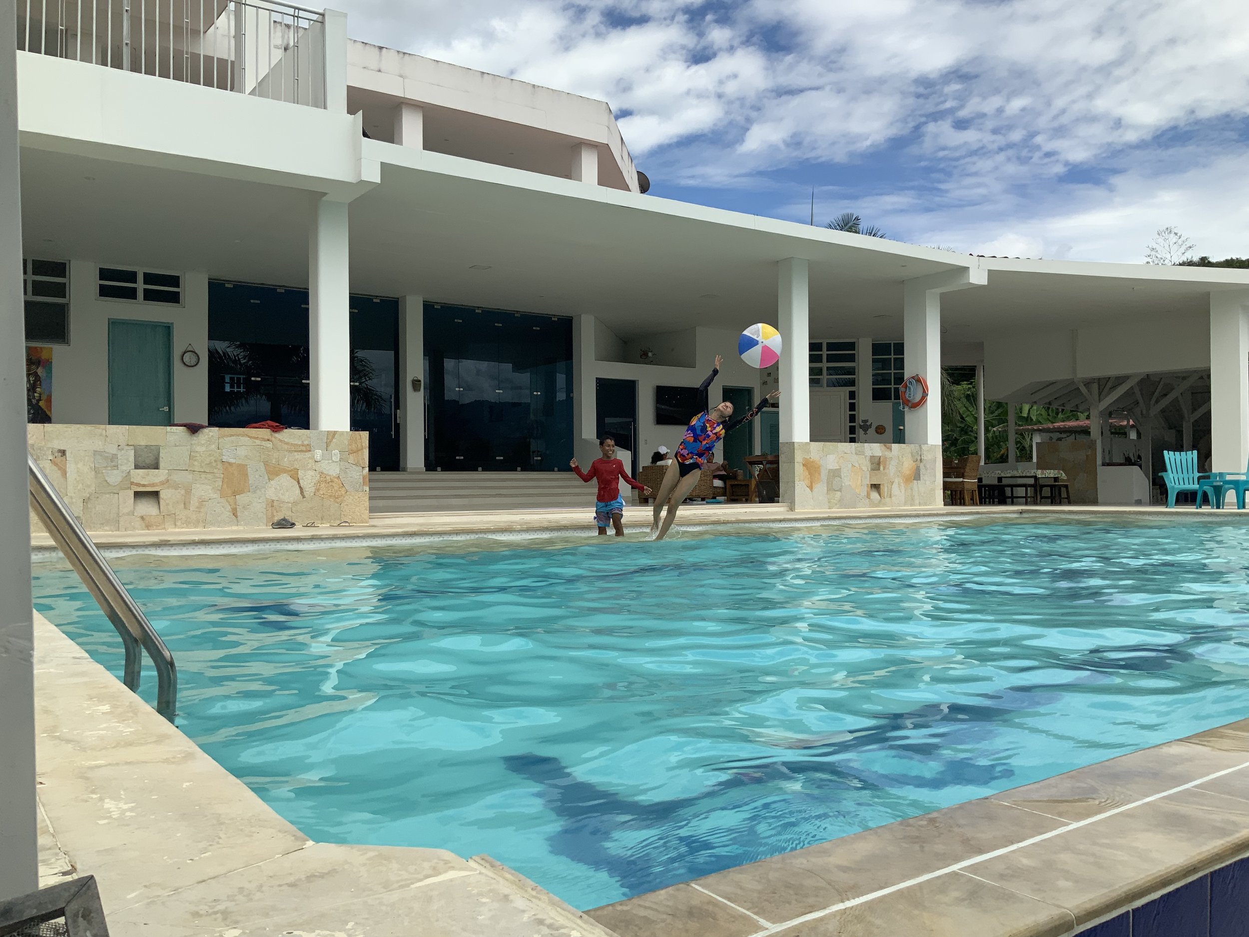 Today was a pool filled day, hence the title. I woke up and had a delicious breakfast consisting of some fruit salad, biscochos ( kind of like a buttery hard and round cookie ), and some orange juice. Back to the Biscochos, I call them Cochinitos which translates into “ pigs.” It is very embarrassing when I’m trying to order these in a breakfast place using what I call them and the waitress has no idea what I’m even saying. Anyway, after stuffing ourselves Santi and I got busy packing our bags even though we are leaving on Friday. We jammed to Veggie Tales ( which has become one of our latest and greatest obsession )then we quickly headed over to the soccer court next door and played a bit of a scrimmage. Winner? We have no idea. We thought it was clear that it was time to freshen up in the pool because we were literally melting in the sun. We quickly jumped in and spent the maximum of 45 minutes giggling and beating each other up with the beach ball. There was a game that we invented where someone would stand on the edge of the pool and the other one would stand in front of him or her and throw the beach ball backwards so the person would have to jump and try to catch it. We did this until Santi accidentally hit me in the face when he threw the ball. We got out and took showers before heading to eat lunch. We went through the same routine of eating our meal and feeling like exploding afterwards. Lunch was amazing though. After, we put Andre down, Santi and I goofed around some more in our room waiting for him to get up. At last we heard him, and Papi brought him out. Immediately the whole family got ready to go into the pool and we had a blast for about an hour. My favorite part was when I would go on Papi’s shoulders and he would launch me into the air. Soon, everyone was exhausted then Santi had to go to Dr. Papi to have a sliver removed from Santi’s big toe. Don’t worry, he’s fine. The operation was successful. We got hungry and ate leftovers from lunch with some toast and Arequipe. DELICIOUS! Right now we are watching Desafio. It is a TV show where different teams face each other off in different challenges. Currently, I am at 4 percent battery so I am going to shut down. Goodnight and God bless.